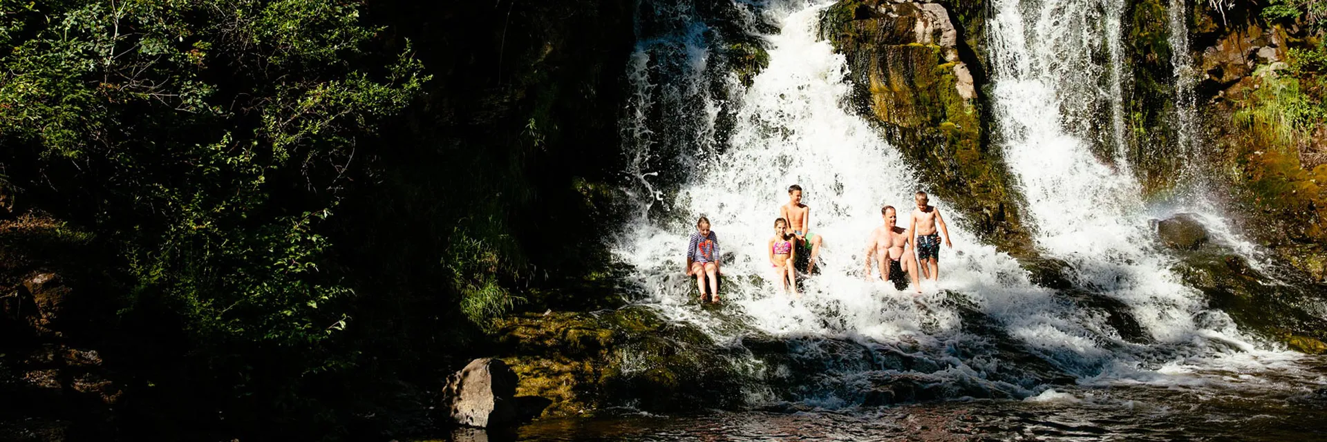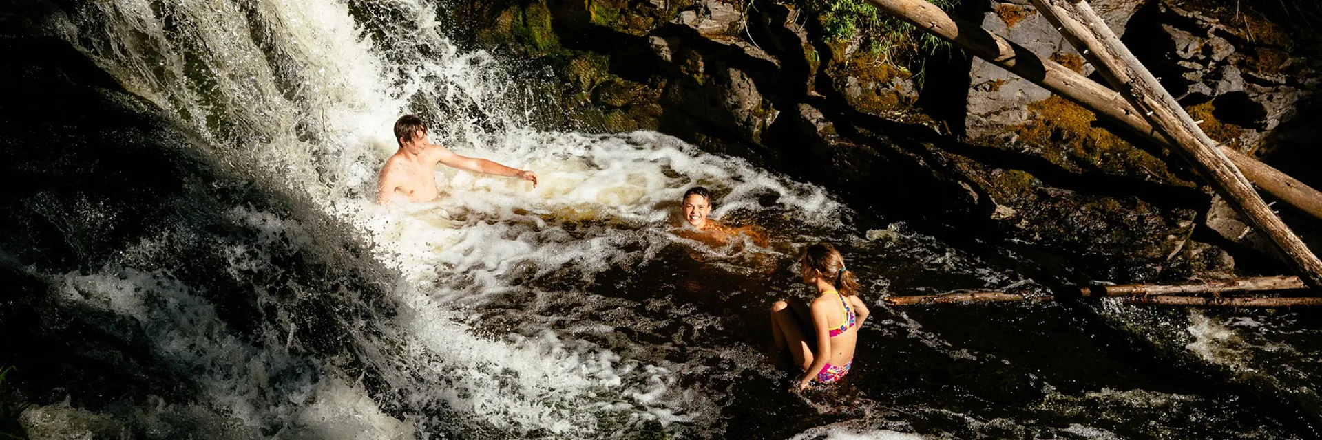 Siwash Lake is a private lake and we have a dock beginning at shore's edge that extends out past the reeds for wonderful swimming right in front of the lodge, as well as another dock further out in deep water. The water is fresh and clear, lightly mineralized, with a depth of about 20 feet, so the temperature is just right for cooling off. Most of our guests, especially the younger bunch, make this a daily event. The lake is a half mile long so keen swimmers can get a good workout if they wish.There's plenty of other opportunities for swimming in the wild while partaking in our guided half-day adventures. Try cooling off in the crystal clear waters of the bubbling pool during our signature Waterfall Fire Ecology Hike™. For those staying five nights and more, during the full day River Safari adventure, there's space in your saddle bags for your swim gear. Your trusty mount will be tied safely nearby while you take a refreshing dip in the river.
